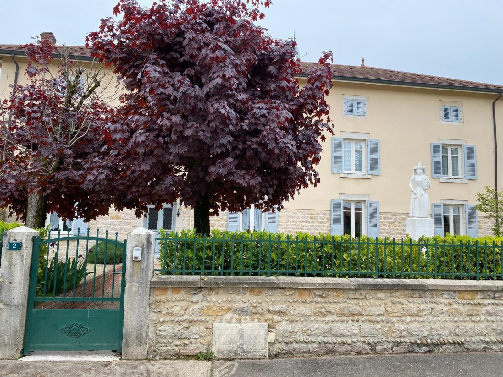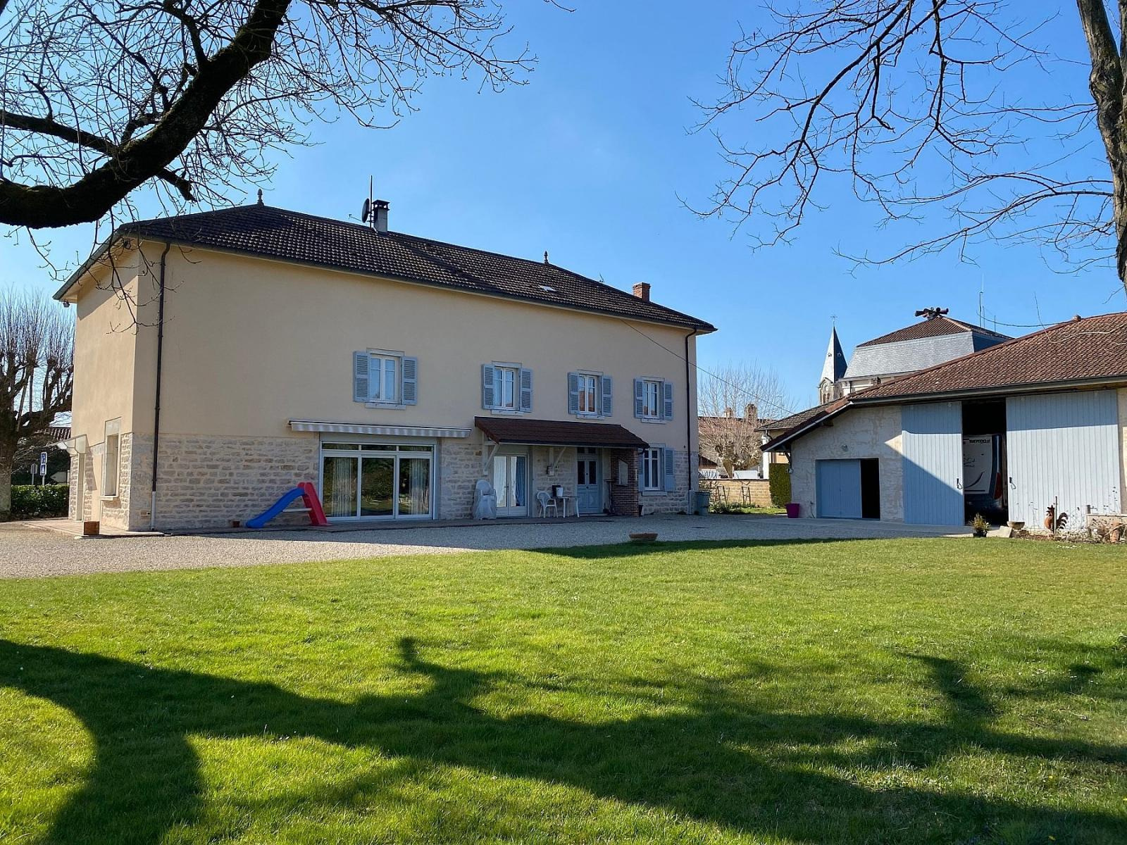 Majestueuse maison bourgeoise située en plein centre du joli village de Cras sur Reyssouze. Sur 3 niveaux, elle se compose au rez de chaussée d'un grand hall d'entrée desservant de part et d'autre une grande cuisine indépendante équipée, le salon séjour de 65.60 m², un bureau et une salle d'eau avec toilette. Vous accédez à l'étage par un bel escalier donnant sur un vaste palier composé de 4 grandes chambres, un couloir avec placards, un toilette, une salle de bains avec douche et un grand débarras. Au troisième étage se trouve un grand grenier de 123 m². La maison possède 2 garages de 23.50 m² et 49 m², une cave de 25.46 m², un atelier et une pièce à aménager + abri bois. L'ensemble édifié sur un terrain très bien entretenu de 2347 m². Tout à l'égout, chauffage chaudière gaz de ville et chauffage au sol + cheminée bois, double vitrage bois. Les +++ : volets roulants sur les baies, adoucisseur d'eau, alarme, aspiration centralisée.