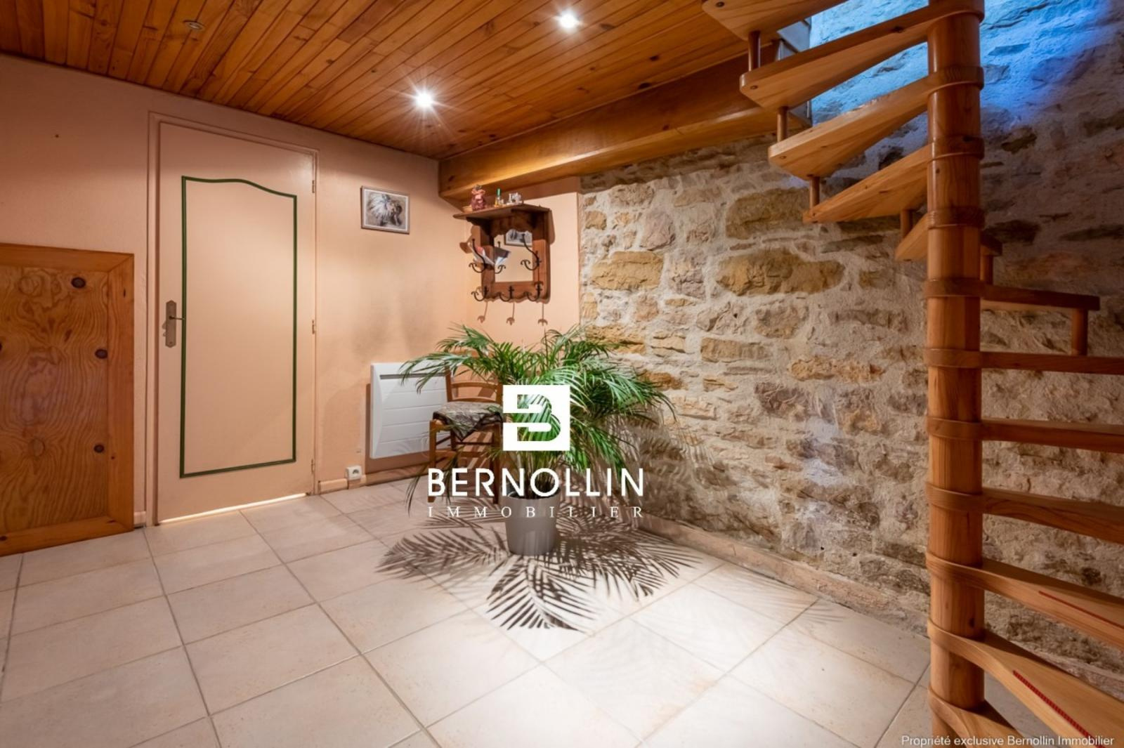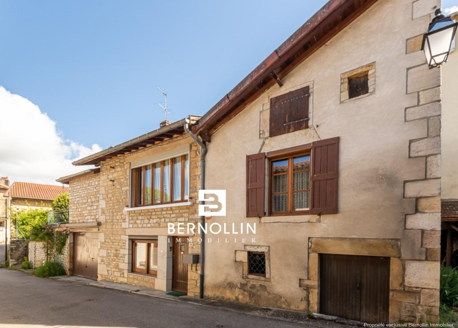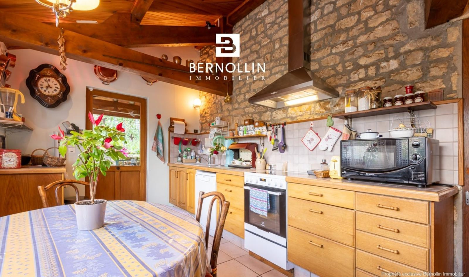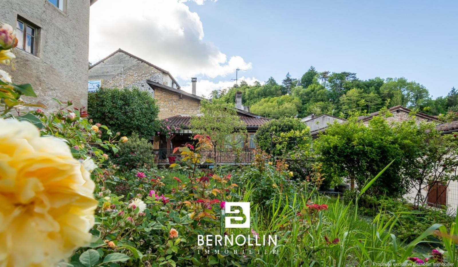 A COLIGNY 01270, maison en pierre de 120 m², comprenant au RDC, un grand garage, une chaufferie, une cave, à l'étage, une grande pièce à vivre avec cheminée et mezzanine, une cuisine équipée, deux chambres, deux pièces d'eau, au deuxième niveau une chambre mansardée. - une terrasse côté ouest donnant sur un terrain de 150 m² arboré.